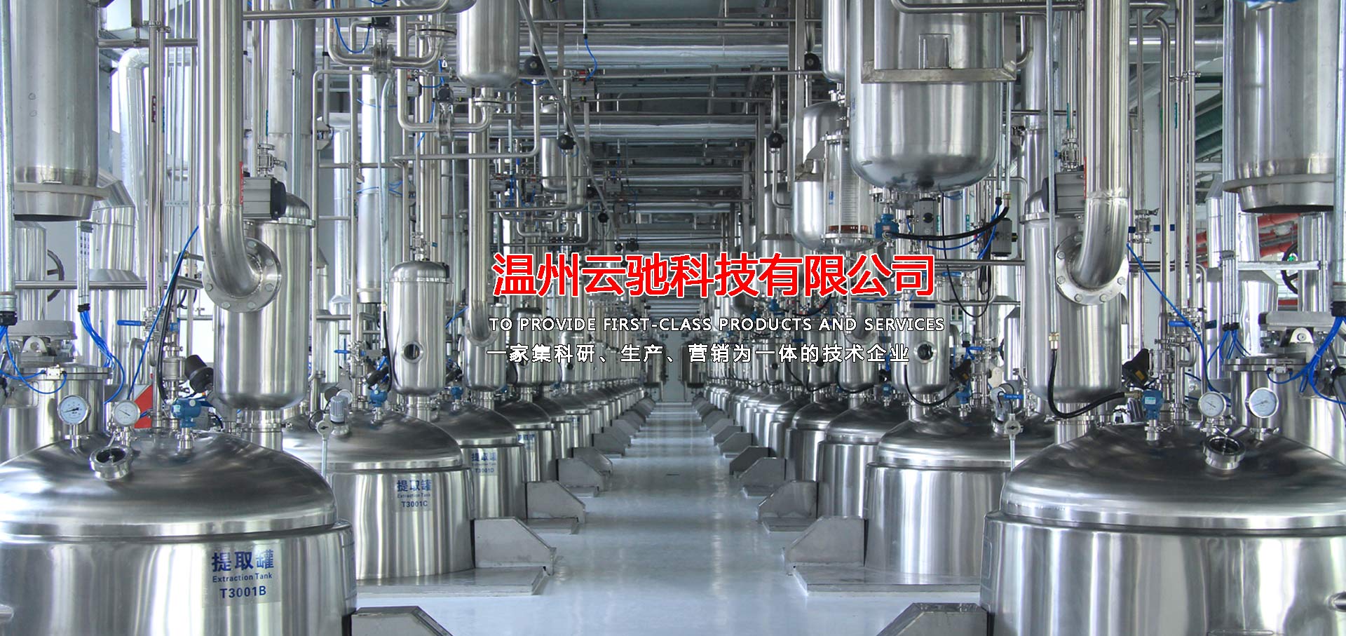 溫州云馳科技有限公司是一家集科研、生產、營銷為一體的技術企業,本公司生產的中藥提取、濃縮、蒸發及有機溶媒回收設備,衛生級不銹鋼容器設備,衛生級管道配件等系列產品,范圍涵蓋制藥工程、乳品工程、生物工程、化工工程等領域,目前,本公司產品包含八大系列和28類品種,分別為中藥提取設備、濃縮設備、純化分離設備,酒精回收設備,配液系統設備,食品乳品機械設備,不銹鋼容器設備以及輔助配套設備等,力爭為廣大客戶提供滿意的交鑰匙工程服務,目前,本公司已與多家科研院所及相關設計單位、行業協會、技術專員合作,建立了完善的科研開發體系,技術力量雄厚,擁有先進的質量保證體系,我們將打造一支素質高,技術精,服務熱情的職業化隊伍,為廣大客戶解決設備工藝上的需求和難題并為廣大客戶提供優質的服務。